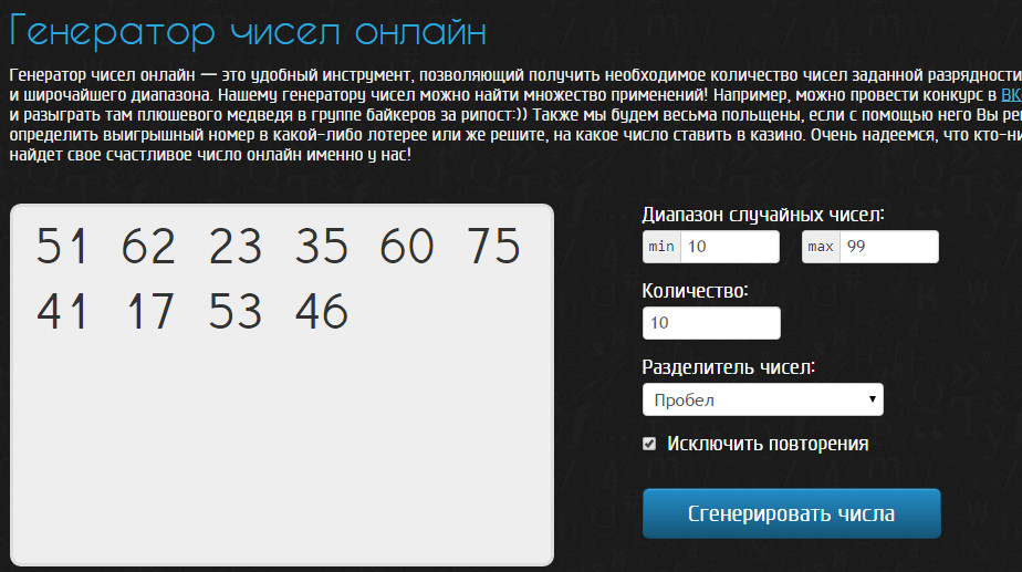 Поэтому наткнувшись на генератор чисел с возможностью выбора: диапазона чисел, количества, быть повторениям или нет.
